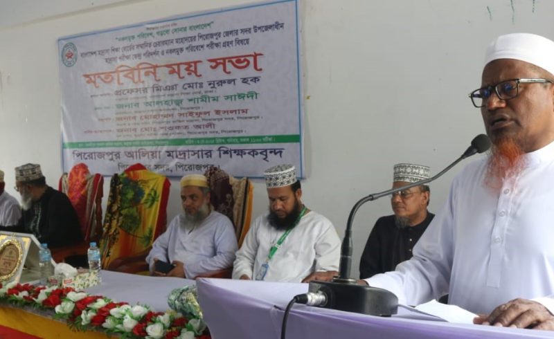 বিগত বছরগুলোতে শিক্ষা ব্যবস্থাকে একেবারে কোল ঠাসা করে রাখা হয়েছে উল্লেখ করে বাংলাদেশ মাদ্রাসা শিক্ষা বোর্ডের চেয়ারম্যান প্রফেসর মিঞা মোহাম্মদ নুরুল হক বলেছেন, বিশেষ করে চাকরির ক্ষেত্রে আমাদের তেমন কোন মূল্য দেওয়া হয় নাই যার কারনে অনেক শিক্ষার্থী হতাশ হয়ে মাদ্রাসা শিক্ষা ব্যবস্থা থেকে সরে গিয়েছে,শিক্ষা বোর্ডের নির্দেশনা অনুযায়ী প্রাপ্ত নাম্বারের চেয়েও বেশি নম্বর দেওয়ার কারণে, নিয়মিত পাঠদান থেকে তারা সরে গিয়েছে। শনিবার (৩ মে) পিরোজপুর জেলার সদর উপজেলারধীন মাদ্রাসা পরীক্ষা কেন্দ্র পরিদর্শন ও নকলমুক্ত পরিবেশে পরীক্ষা গ্রহণ বিষয়ে শিক্ষকদের সাথে মতবিনিময় সভা অনুষ্ঠানে বাংলাদেশ মাদ্রাসা শিক্ষা বোর্ডের চেয়ারম্যান প্রফেসর মিঞা মোহাম্মদ নুরুল হক এ সব কথা বলেন। এসময় তিনি পিরোজপুর আলিয়া মাদ্রাসার শিক্ষকবৃন্দের আয়োজনে আল্লামা সাঈদী ফাউন্ডেশন এর তাফহীমুল কুরআন আলিয়া মাদ্রাসা মিলনায়তনে অনুষ্ঠিত সভায় প্রধান অতিথি হিসেবে উপস্থিত ছিলেন। এ সভায় পিরোজপুর ফাজিল মাদ্রাসার অধ্যক্ষ মোহাম্মদ সাইফুল ইসলামের সভাপতিত্বে বিশেষ অতিথি হিসেবে উপস্থিত ছিলেন আল্লামা সাঈদী ফাউন্ডেশনের চেয়ারম্যান শামীম সাঈদী, সদরের হল সুপার মোহাম্মদ শওকত আলী। সভায় প্রধান অতিথি বলেছেন, আমরা আগামী অর্থবছরে প্রতিটি জেলায় শিক্ষকদের প্রশিক্ষণের জন্য ট্রেনিং ইনস্টিটিউট করব। যে সকল প্রতিষ্ঠানের সরকারি ভবন নেই সেখানে সরকারি ভবন দেওয়ার ব্যবস্থা করব পিছিয়ে পড়া এবং মেধাবী শিক্ষার্থীদের শিক্ষাবৃত্তি দেওয়া হবে। যেহেতু আমাদের বিপ্লব হয়েছে আমরা এই পরিস্থিতি থেকে যেকোনো মূল্যে আমাদের সেই আগের জায়গায় ফিরে যাব ইনশাআল্লাহ।