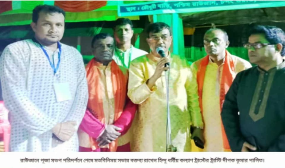 রয়েল দত্ত, রাউজান প্রতিনিধি: রাউজানে শারদীয় দুর্গোৎসবের মহা অষ্টমীতে রাউজান পৌরসভা এলাকায় বিভিন্ন পূজা মণ্ডপ পরিদর্শন ও মতবিনিময় সভা করেছেন সরকারের ধর্ম মন্ত্রণালয়ের অধীন হিন্দু ধর্মীয় কল্যাণ ট্রাস্টের ট্রাস্টি দীপক কুমার পালিত সহ একটি প্রতিনিধি দল। এসম বাংলাদেশ পূজা উদযাপন পরিষদ চট্টগ্রাম জেলা ও রাউজান পৌরসভা পূজা উদযাপন পরিষদের নেতৃবৃন্দরা উপস্থিত ছিলেন। জানা যায়, রাউজান পৌরসভার ০৮ নং ওয়ার্ডের চৌধুরী বাড়ি সার্বজনীন দুর্গা মণ্ডল, ঢেউয়াপাড়া জগন্নাথ সেবাশ্রমে উদয়াচল সংসদ পূজা মণ্ডপসহ কয়েকটি পূজা মণ্ডপ পরিদর্শন করেন। এসময় অন্যান্যদের মধ্যে উপস্থিত ছিলেন চট্টগ্রাম জেলা পূজা উদযাপন পরিষদের সহ-সাংগঠনিক সম্পাদক অধ্যাপক শিপুল দে, লায়ন মুনমুন দত্ত মুন্না, লায়ন সম্পদ দে, লায়ন সন্তোষ কুমার নন্দী, রাউজান পৌরসভা পূজা উদযাপন পরিষদের সভাপতি সদীপ দে সজীব, সাধারণ সম্পাদক দীপ্ত চৌধুরী, পৌর পূজার উদযাপন কমিটির সহ সভাপতি দিবাকর বোস, পূজা কমিটির প্রনব দে, গোকুল চৌধুরী, ত্রিপল চৌধুরী, সনজিত দে,শংকর দে, মিশু মহাজন প্রমুখ।