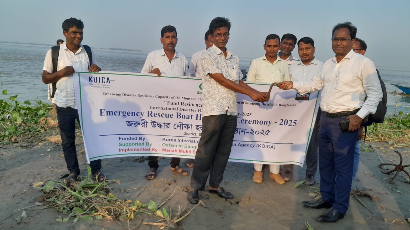 অক্সফাম-এর সহযোগিতায় স্থানীয় বেসরকারি সংস্থা মানব মুক্তি সংস্থা বাস্তবায়িত ‘এনহ্যান্সিং ডিজাস্টার রেজিলিয়েন্স ক্যাপাসিটি (ইডিআরসি)’ প্রকল্পের আওতায় সিরাজগঞ্জ জেলা দুর্যোগ ব্যবস্থাপনা কমিটি ও রাজাপুর ইউনিয়ন দুর্যোগ ব্যবস্থাপনা কমিটিকে নৌকাগুলো প্রদান করা হয়।