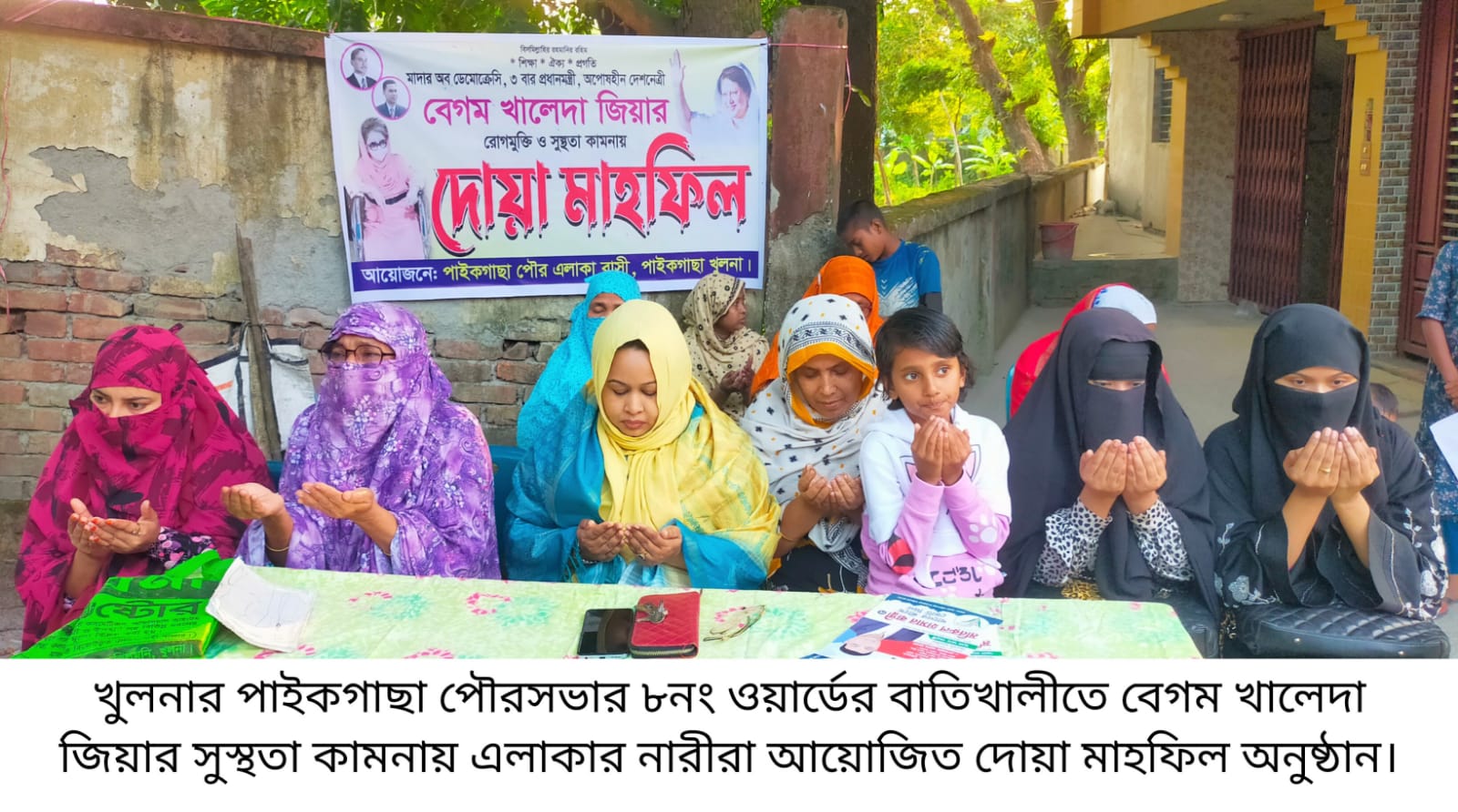 পাইকগাছা (খুলনা) উপজেলা সংবাদদাতা। খুলনার পাইকগাছায় নারীদের উদ্যোগে সাবেক প্রধানমন্ত্রী ও বিএনপির চেয়ারপার্সন বেগম খালেদা জিয়ার সুস্থতা কামনায় দোয়া মাহফিল অনুষ্ঠিত হয়েছে। ১৮ ডিসেম্বর বৃহস্পতিবার বিকেলে পৌরসভার ৮নং ওয়ার্ড বাতিখালীতে উপজেলা বিএনপির সাবেক সাধারণ সম্পাদক এসএম এনামুল হকের নির্দেশনায় এলাকার নারীরা এ দোয়া মাহফিল এর আয়োজন করে। পৌরসভা মহিলা দলের নেত্রী সুলতানা লাবনীর সভাপতিত্বে অনুষ্ঠিত দোয়া মাহফিল অনুষ্ঠানে উপস্থিত ছিলেন সালমা আক্তার, তামান্না ইয়াসমিন, ফাতেমা খাতুন, নুরজাহান বেগম, কুলসুম বেগম, সোনিয়া খাতুন, পারুল বেগম, যমুনা রাণী ঢালী, সালমা খাতুন, সুমিত্রা ঘোষ, অনিমা রাণী ঢালী, তনুশ্রী মন্ডল, রেখা রাণী সানা, পার্বতী মন্ডল, সুমী হালদার, অর্চনা সরকার, কবিতা সানা, অঞ্জনা, লক্ষী রাণী, শেফালী, সরস্বতী, কাকলী ও আরতী। অনুষ্ঠানে সাবেক প্রধানমন্ত্রী বেগম খালেদা জিয়া ও ইনকিলাব মঞ্চের মুখপাত্র শরীফ ওসমান হাদীর সুস্থতা কামনা এবং ত্রয়োদশ জাতীয় সংসদ নির্বাচনে খুলনা -৬ আসনের বিএনপি মনোনীত প্রার্থী মনিরুল হাসান বাপ্পীর ধানের শীষ প্রতীকের বিজয় কামনা করে দোয়া অনুষ্ঠান পরিচালনা করেন সেলিনা আক্তার।