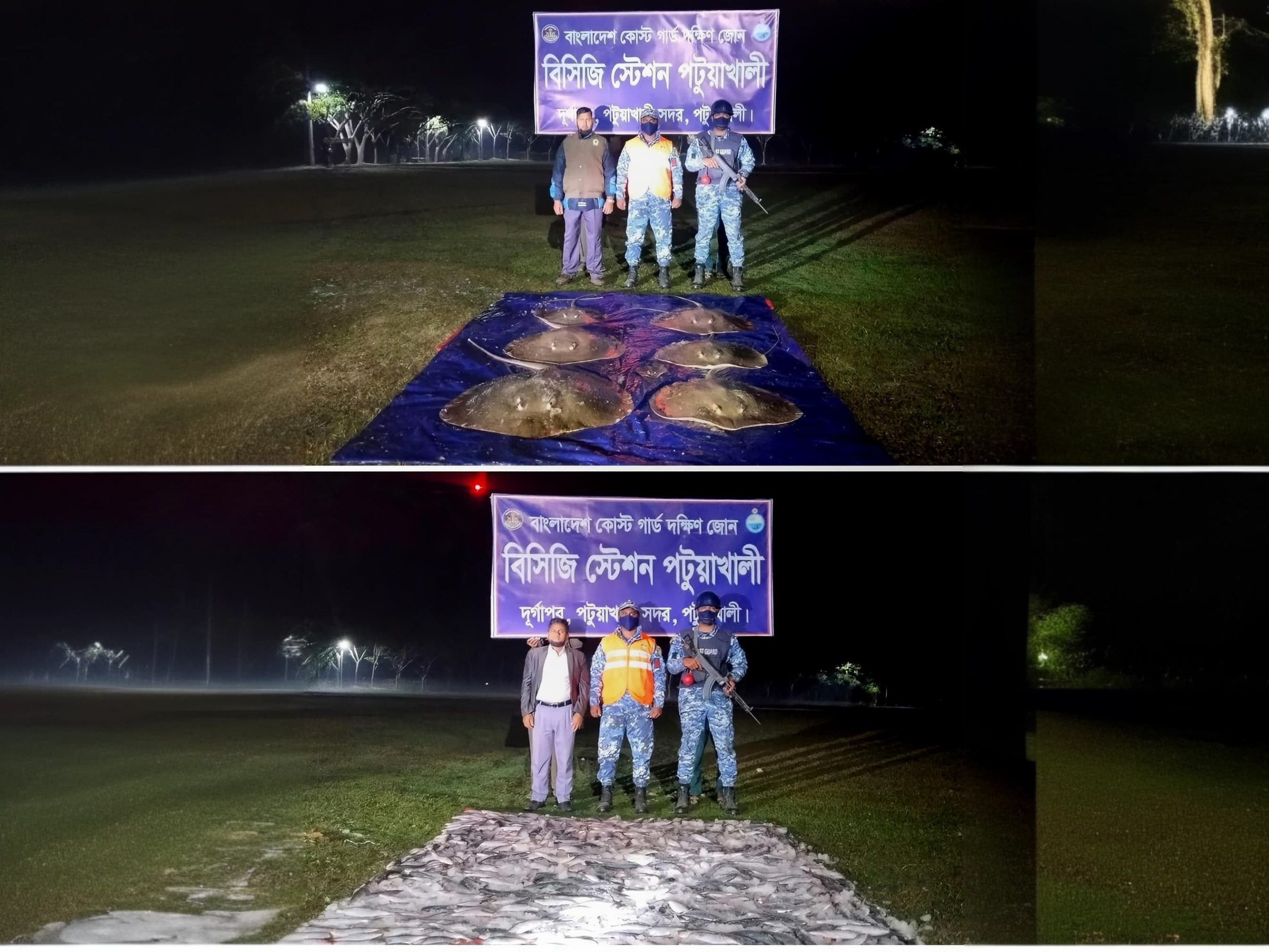 আজ কোস্টগার্ড কর্তৃক প্রদানকৃত সংবাদবিজ্ঞপ্তিতে জানায়, গত ৬ ফেব্রুয়ারি শুক্রবার রাত ১১টায় পটুয়াখালী সদর টোল প্লাজা সংলগ্ন এলাকায় যৌথ অভিযান পরিচালিত হয়। অভিযান চলাকালে সন্দেহজনক একটি যাত্রীবাহী বাস তল্লাশি করে প্রায় ১৫ লাখ ৭৫ হাজার টাকা মূল্যের ৬৩০ কেজি শাপলাপাতা মাছ এবং প্রায় ৩ লাখ ৮৫ হাজার টাকা মূল্যের ৫৫০ কেজি জাটকা জব্দ করা হয়। এ সময় বাস চালক ও হেল্পারের কাছ থেকে মুচলেকা নিয়ে বাসসহ ছেড়ে দেওয়া হয়।