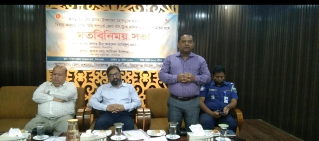 আব্দুর রাজ্জাক বাবু, সিরাজগঞ্জ: আসন্ন ঈদ-উল-আযহা উপলক্ষ্যে- মহাসড়কে যানবাহন চলাচলের বিষয়ে অনুসৃত নিয়ম বা বিধি সম্পর্কে সিরাজগঞ্জ জেলা বাস, ট্রাক মালিক ও শ্রমিক সমিতির নেতৃবৃন্দদের সাথে মতবিনিময় সভা অনুষ্ঠিত গয়েছে।