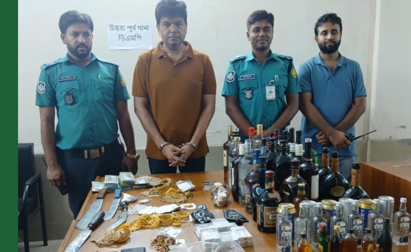 বিপুল পরিমাণ বিদেশী মদ, মুদ্রা ও দেশীয় অস্ত্রসহ একজনকে গ্রেফতার করেছে উত্তরা পূর্ব থানা পুলিশ