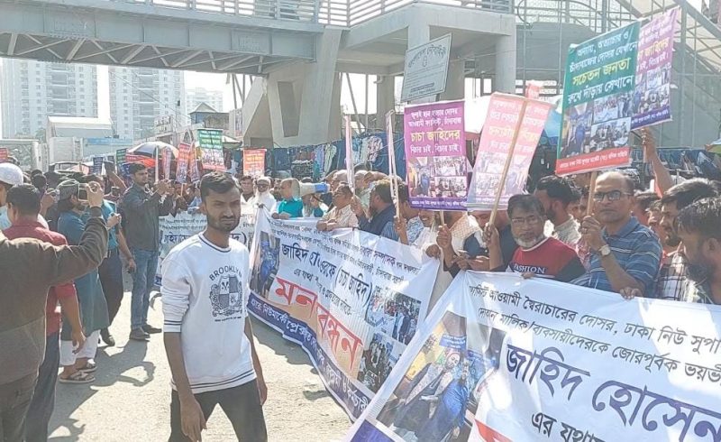রাজধানীর নিউ মার্কেট এলাকায় চাঁদাবাজি বন্ধের ব্যবসায়ীদের মানববন্ধন।